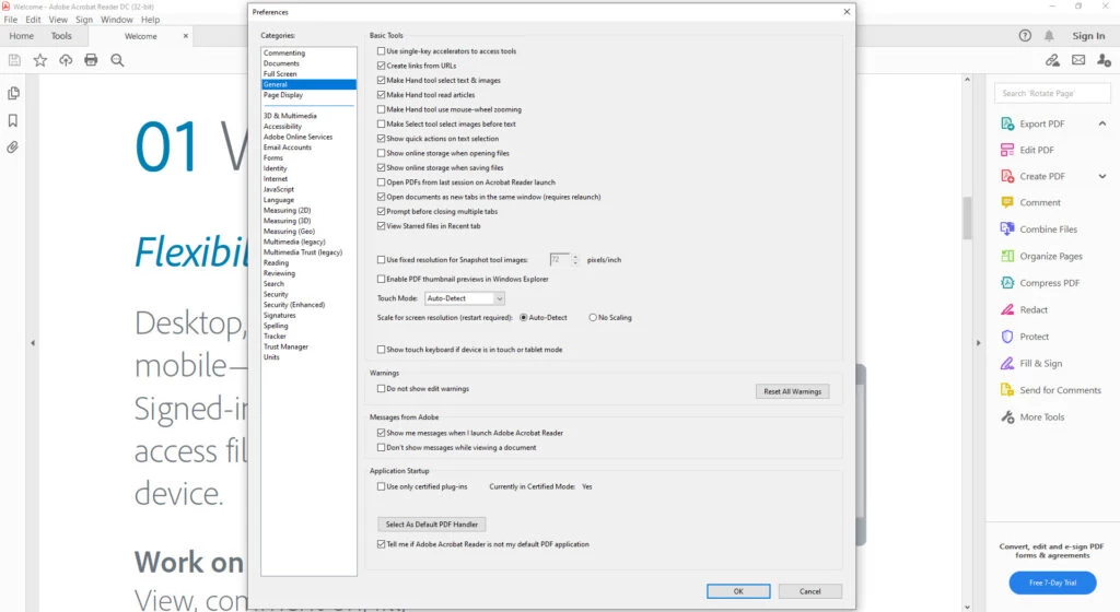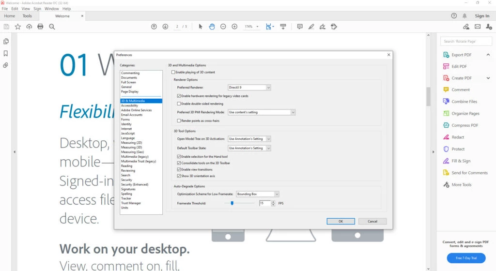 원하는 대로 도구를 사용자 정의하기 위해 설정을 수정할 수 있습니다. 환경 설정을 클릭하고 주석, 3D 및 멀티미디어, 측정 및 읽기, 철자, 페이지단위 구성등을 사용자 정의합니다. 게다가 CreatePDF는좋아하는 파일을 PDF 형식으로 변환하는 데에도 사용할 수 있습니다.
